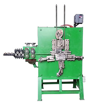 特種打扣機是我司根據市場需求,在打扣機的基礎上設計制造的特定金屬線材扣自動生產機械。該機械采用電機提供動力,機械式傳動,傳動方式包括皮帶、齒輪、凸輪、導軌、彈簧等。通過傳動機構巧妙的傳動,配合模具,可以生產不同規格的特定金屬線扣。例如:鉤扣,拉芯扣,針管扣,針扣,羊角扣,轉扣,豬膽扣等。適用線材包括:鐵線,不銹鋼線,銅線,鋁線等。模具采用堅固耐磨的鉻鋼(Cr12MoV),可長期使用。電機采用名牌全銅電機,經久耐用。機械全自動生產,保養簡單,廣泛運用于服飾、包包、燈飾、家用小五金、鐵藝五金等行業。