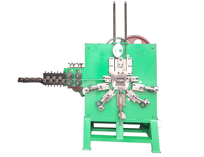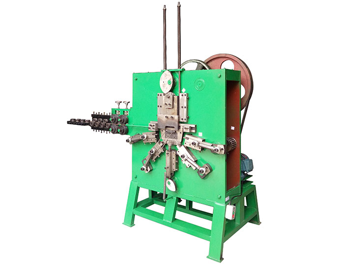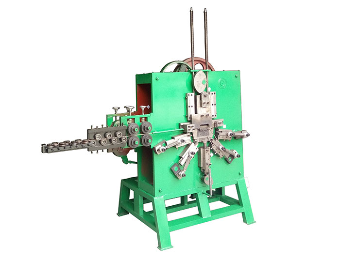 打扣機是我司根據(jù)市場需求設(shè)計制造的金屬線材扣自動生產(chǎn)機械。該機械采用電機提供動力,機械式傳動,傳動方式包括皮帶、齒輪、凸輪、導(dǎo)軌、彈簧等。通過傳動機構(gòu)巧妙的傳動,配合不同的模具,可以生產(chǎn)不同形狀的金屬線扣。例如:D形扣,S形扣,方形扣,打包扣,夾子扣,跑道形扣,提手扣等。適用線材包括:鐵線,不銹鋼線,銅線,鋁線等。模具采用堅固耐磨的鉻鋼(Cr12MoV),可長期使用。電機采用名牌全銅電機,經(jīng)久耐用。機械全自動生產(chǎn),保養(yǎng)簡單,廣泛運用于服飾、包包、燈飾、家用小五金、鐵藝五金等行業(yè)。